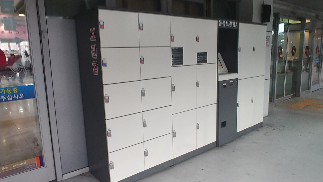 충주공용버스터미널(충주시외버스터미널)의 물품보관함과 관광안내소입니다. (2018년 촬영분.)